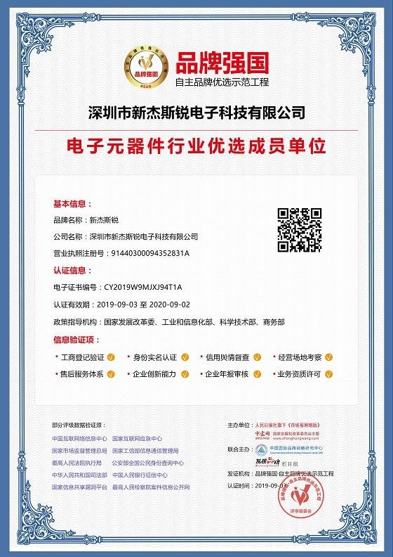 新杰斯銳經(jīng)過資質(zhì)審核、輿情監(jiān)控等層層篩選,成功入選為品牌強(qiáng)國示范工程電子元器件行業(yè)優(yōu)選成員單位,企業(yè)信息錄入品牌強(qiáng)國示范工程數(shù)據(jù)庫,在國家級平臺向公眾展示品牌形象。